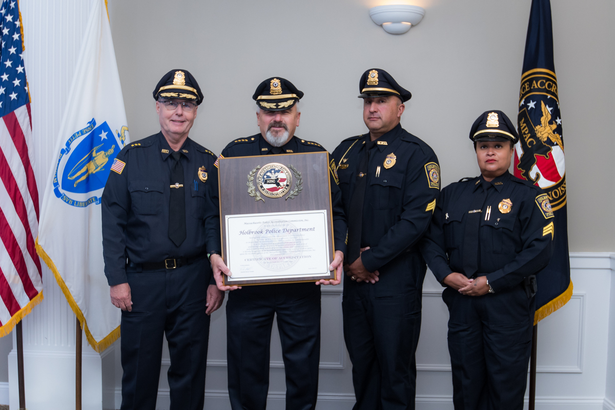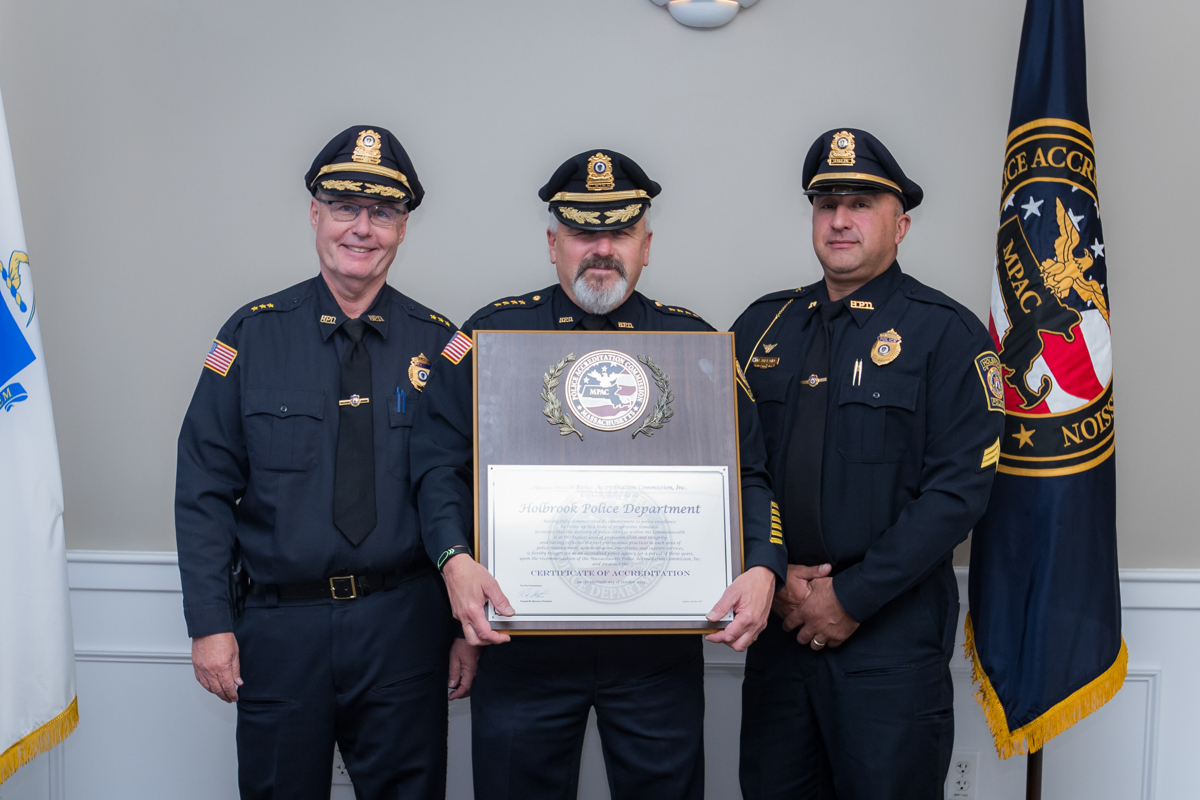 Holbrook Police is Accredited by the Massachusetts Police Accreditation Commission (MPAC). To become an Accredited organization includes a rigorous independent review and evaluation by MPAC, of the department’s 257 mandatory standards and 125 optional standards.