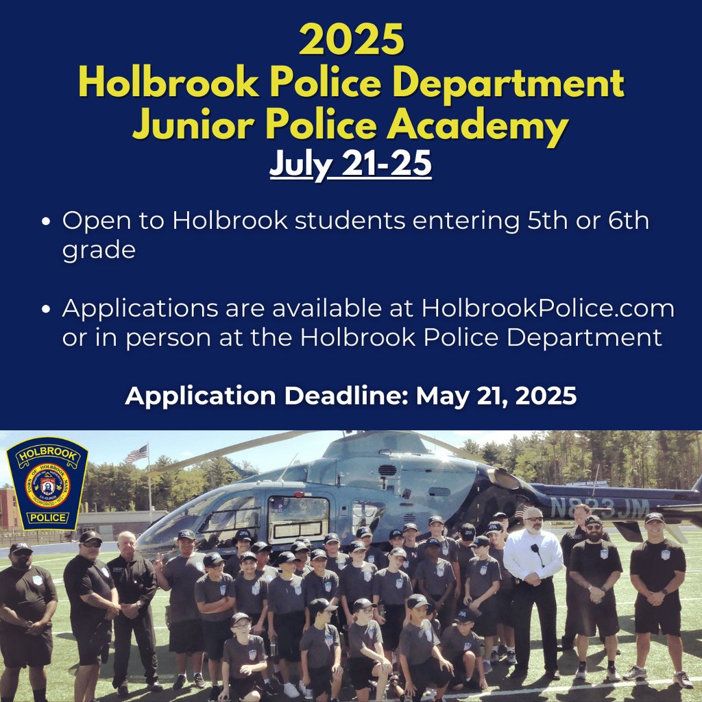 The application deadline is May 21, 2025. To sign up, visit HolbrookPolice.com/Junior-Police-Academy or visit the Holbrook Police Department in person for an application.